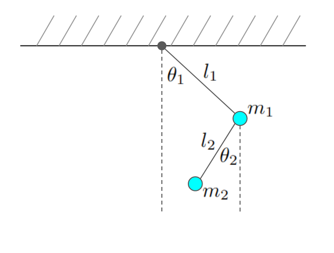 The kinetic and potential energy of this system can be calculated: \begin{equation} \begin{split} &T = \frac{1}{2} m_1 \left(l_1 \dot{\theta_1}\right)^2 + \frac{1}{2}m_2\left[\left(l_1\dot{\theta}_1\right)^2 + \left(l_2\dot{\theta}_2\right)^2 + 2 l_1 l_2 \dot{\theta}_1\dot{\theta}_2 \cos(\theta_1 - \theta_2)\right]\\ &U = -m_1 g \left(l_1 \cos\theta_1\right) - m_2 g \left[l_1 \cos\left(\theta_1\right) + l_2 \cos\left(\theta_2\right)\right] \end{split} \end{equation} Where a dot indicates the time derivative $\frac{d}{dt}$ and $g$ indicates the gravitational acceleration. The potential energy is set to zero at the ceiling. The lagrangian is calculated as: \begin{equation} L = T - U \end{equation} Which brings us to the equations of motion using Lagrange's equations: \begin{equation} \begin{split} &\frac{\partial L}{\partial \theta_1} - \frac{d}{dt}\frac{\partial L}{\partial \dot{\theta_1}} = 0\\ &\frac{\partial L}{\partial \theta_2} - \frac{d}{dt}\frac{\partial L}{\partial \dot{\theta_2}} = 0 \end{split} \end{equation} These equations can be rewritten in the following way: \begin{equation} \begin{split} &\ddot{\theta_1} = -\frac{(2 m_1 + m_2)g\sin(\theta_1) + m_2 g \sin\left(\theta_1 - 2 \theta_2\right) + 2 m_2\sin\left(\theta_1 - \theta_2\right)\left(l_2\dot{\theta_2}^2 + l_1\dot{\theta_1}^2 \cos \left(\theta_1 - \theta_2\right)\right)}{l_1 \left(2 m_1 + m_2 - m_2 \cos \left(2\theta_1 - 2\theta_2\right)\right)}\\ &\ddot{\theta_2} = \frac{2 \sin \left(\theta_1 - \theta_2\right)\left[l_1 (m_1 + m_2) \dot{\theta_1}^2 + (m_1 + m_2) g \cos \left(\theta_1\right) + l_2 m_2 \dot{\theta_2}^2 \cos \left(\theta_1 - \theta_2\right) \right]}{l_1 \left(2 m_1 + m_2 - m_2 \cos \left(2\theta_1 - 2\theta_2\right)\right)} \end{split} \end{equation} Which can be converted to a system of four ordinary differential equations by using $\omega_1 \equiv \dot{\theta_1}$ and $\omega_2 \equiv \dot{\theta_2}$. These equations can now be solved numerically using the Runge-Kutta method.