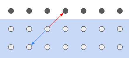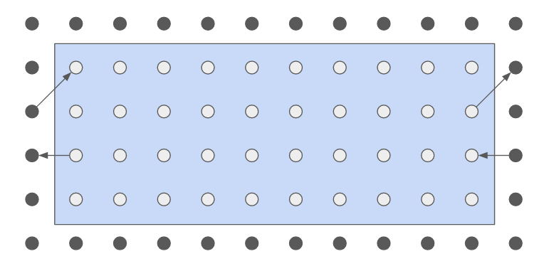 After the collision step, we can perform the streaming step, completing the Lattice Boltzmann Equation: \begin{equation} f_i(\boldsymbol{r}, t + 1) = f_i^\ast(\boldsymbol{r} - \boldsymbol{c}_i, t) \end{equation} Boundary conditions have to be taken into account during the streaming step. This specific simulation makes use of periodic boundary conditions connecting the left and right of the domain. Periodic boundary conditions applied on the distribution function can be written down in a general manner: \begin{equation} \boldsymbol{f}^\ast(\boldsymbol{r} + \boldsymbol{L}, t) = \boldsymbol{f}^\ast(\boldsymbol{r}, t) \end{equation} Where $\boldsymbol{L}$ is a vector containing the sidelengths for a square domain. This means that the populations streaming out of the domain on the right side enter the nodes on the left, and vice versa.